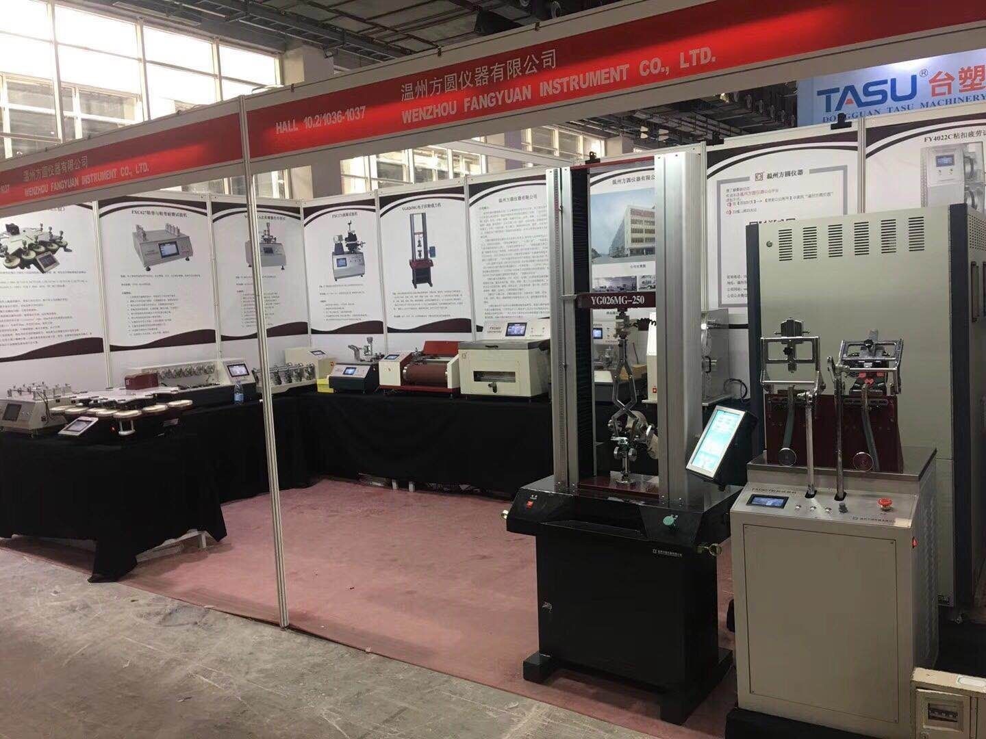 溫州方圓儀器有限公司應(yīng)展覽會主辦方邀請,參加此次展會,并實物展出了:FY600日曬氣候老化儀、YG028萬能材料試驗機、FXC651耐折試驗機、YG401FII織物平磨儀、XGMCIIA皮革摩擦色牢度儀、FXC621耐磨試驗機、FXC171剝離試驗機、FXC623鞋用纖維曲撓儀、FXC627鞋帶與鞋帶耐磨試驗機等16種鞋類、皮革檢測儀器。